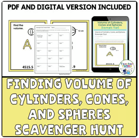 Check out these activities for finding volume of cylinders, cones, and spheres. We also have a unit to make teaching the volume of cylinders, cones, and spheres easy!